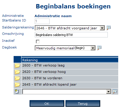 Bij een nieuwe beginbalans boeking zal u eerst op de knop 'OK' moeten klikken, dan verschijnt het menu met de grootboekrekeningen waarvan de saldi moeten worden afgeboekt. Met de dropdown kan u één voor één de grootboekrekeningen toevoegen aan deze boeking.