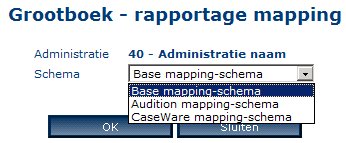 Stamgegevens > Financieel > Inrichting > Rapportage mappingDe bedrijfsnaam wordt hier vermeld en het mapping-schema. Als u meerdere bedrijven (administraties) heeft, dan dient voor elke administratie apart het schema ingedeeld te worden. Daar iedere administratie een apart grootboekrekeningschema heeft / kan hebben.